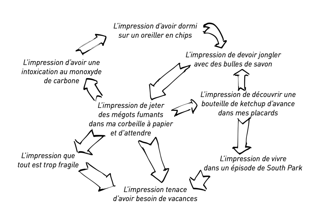 Le zine de ce mois-ci est un catalogue de moments, racontés au travers des impressions qu'ils m'ont faites — l'impression d'avoir dormi sur un oreiller en chips, l'impression d'être le pire DJ de mariage du monde, l'impression de passer directement des anciens francs aux euros, etc. , avec aussi des flèches partout, des moments pas gais et des blagues aussi, et surtout des nœuds spatio-temporels.